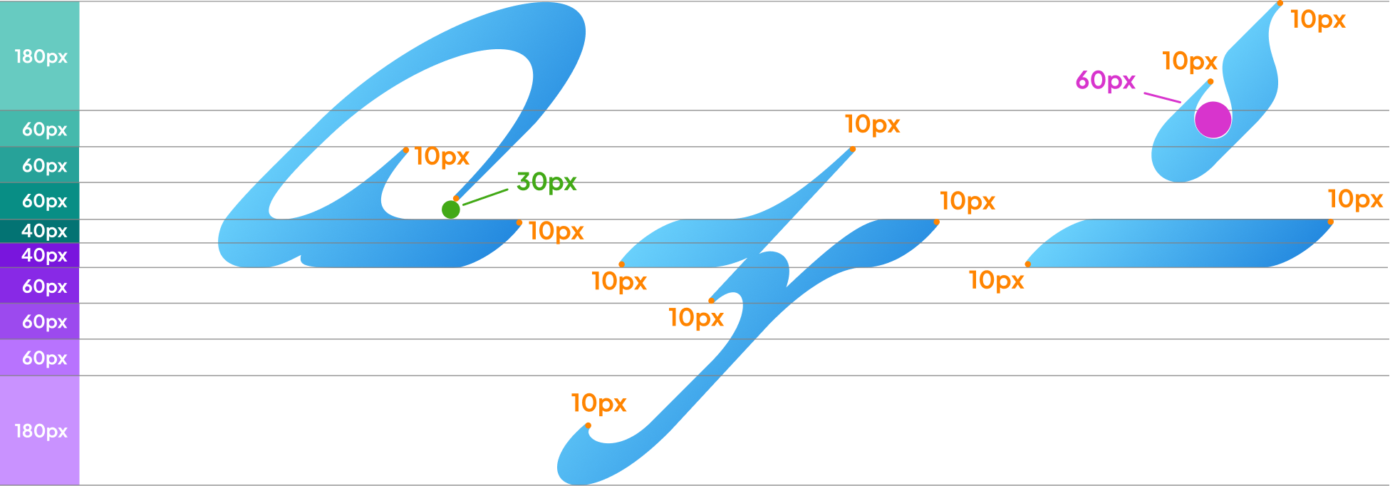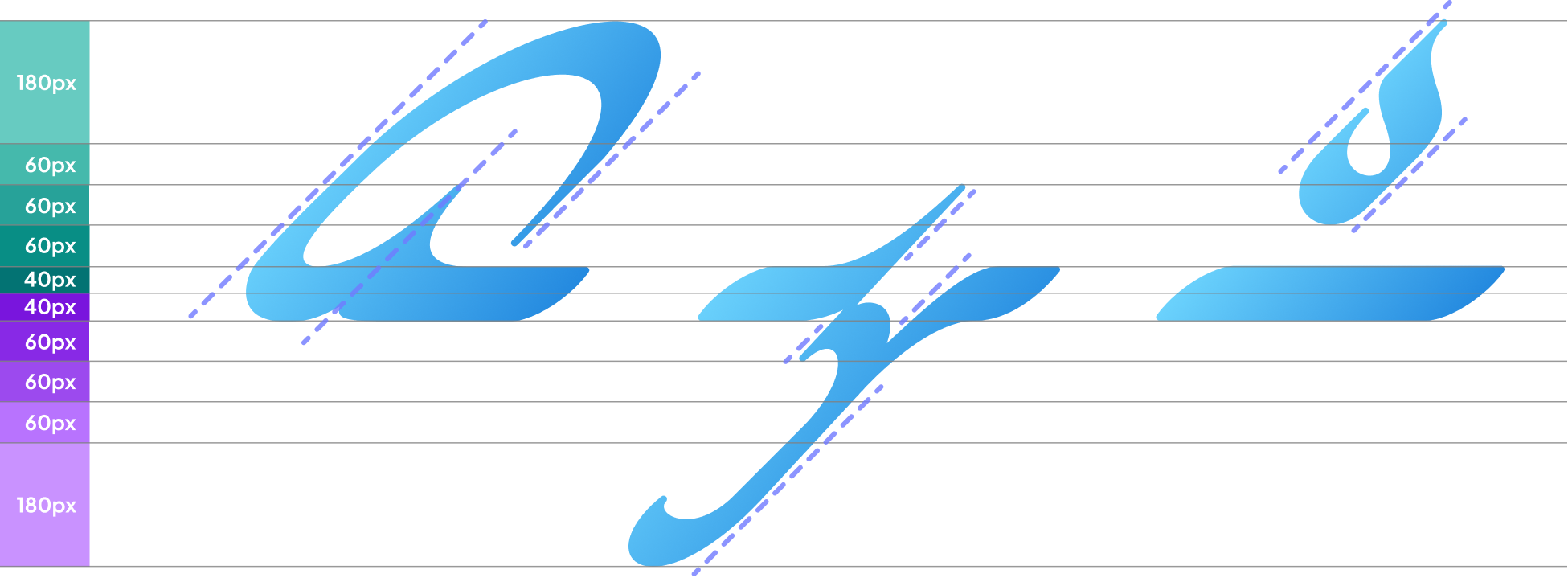 Several design criteria were used in the making of each character to ensure stylistic consistency. The 45 degree angle mentioned earlier forms the basis of each stroke. The width of the calligraphic pen (depicted in the file at a 108px rounded rectangle) was used to enforce that all depicted stokes were actually possible. Rounded edges were all made to conform to a 10px circle, and circles of scaled in multiples of that (30px, 60px) were used to establish distances and negative spaces.