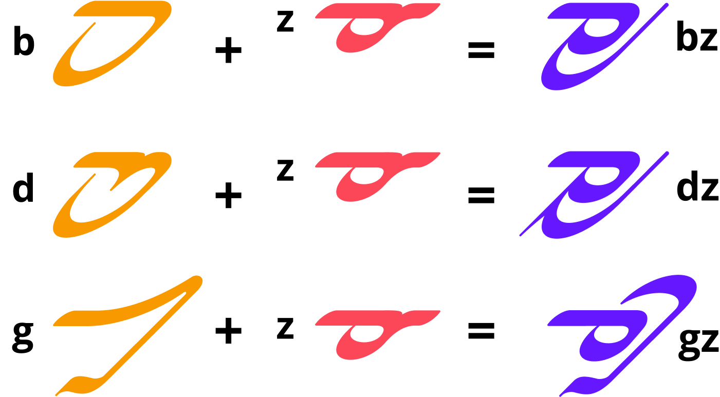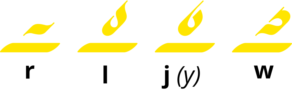 Flows can be written above other characters to form combined sounds—those produced simultaneously in speech. In these combinations, the base character is read first, then modified by the Flow above it.