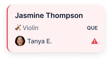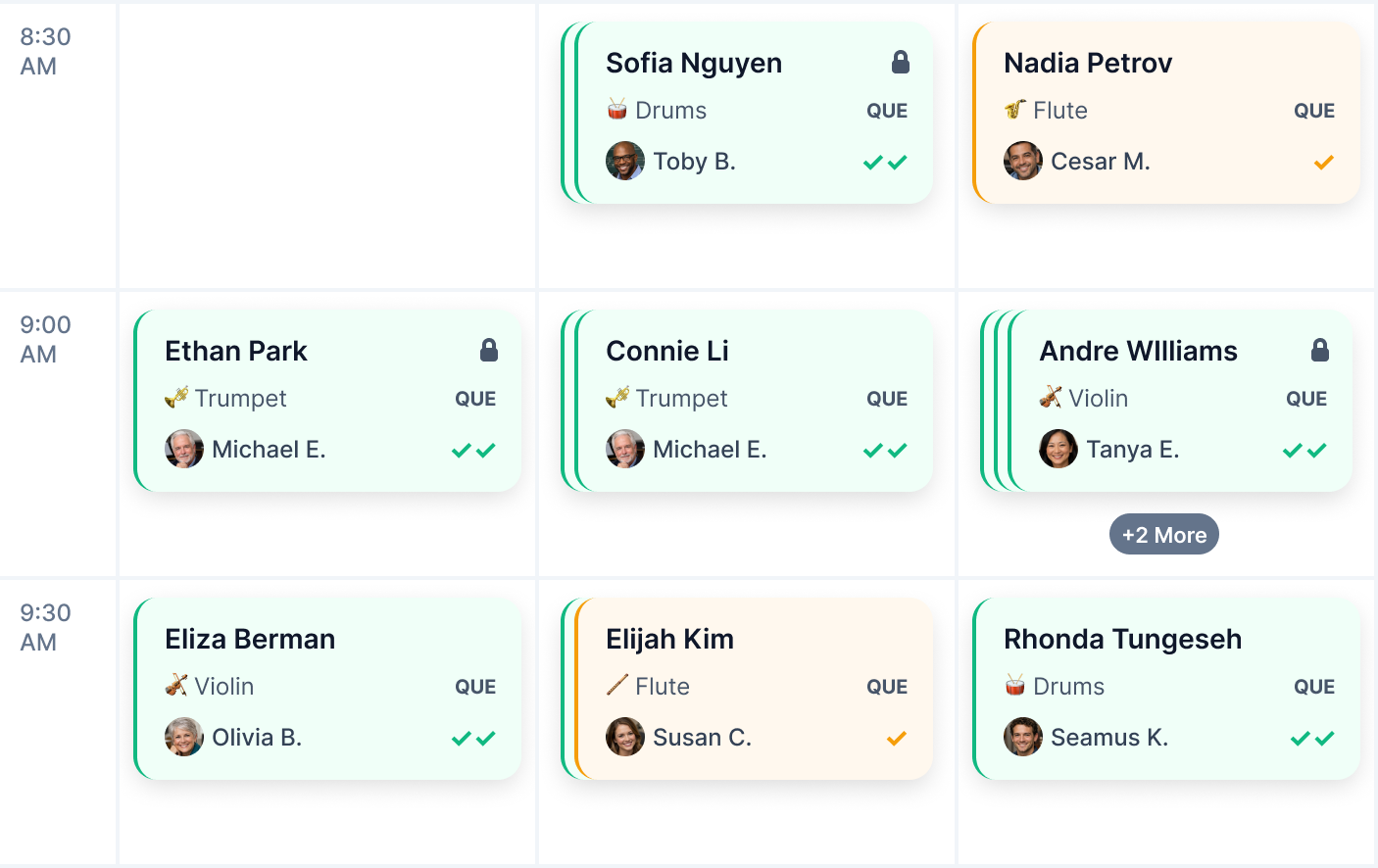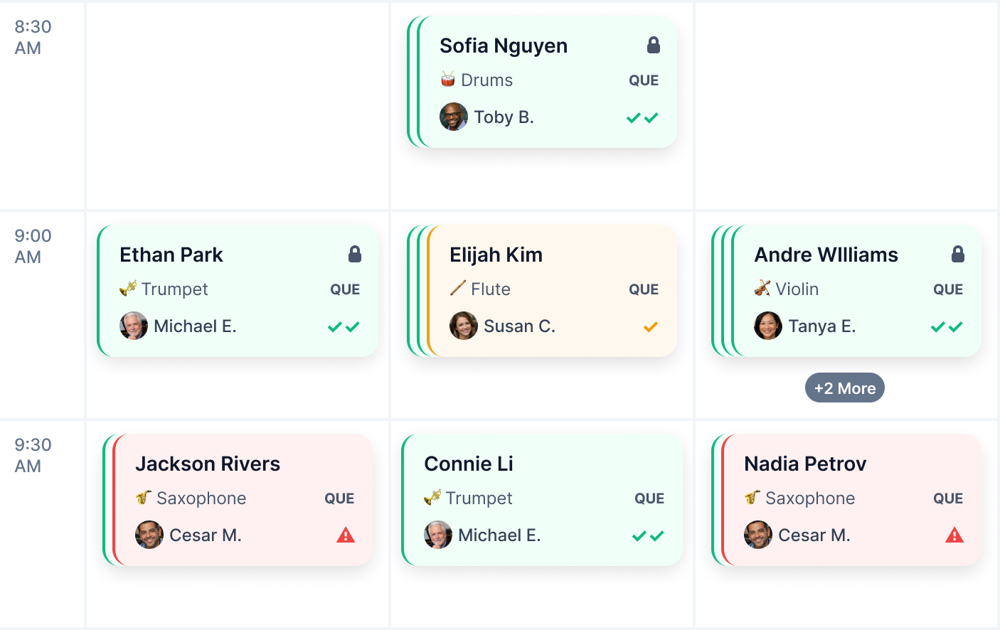 Instead of coloring cards by teacher or instrument, I used confidence-based color coding: green for strong matches, yellow for acceptable placements, and red for compromises.