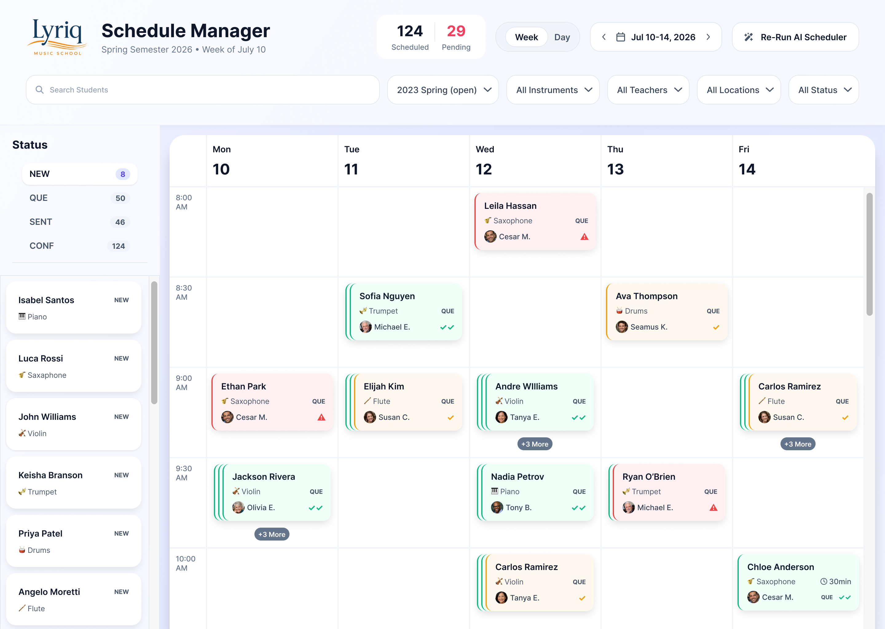 Lyriq schedules more than 300 students across multiple teachers, instruments, locations, and family constraints. I designed a hybrid AI-assisted system that generates an initial schedule, scores placement quality, and allows administrators to review, adjust, and finalize the result.